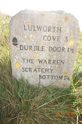 Walking through the military firing range at Lulworth is one of the highlights of this section.  It is demanding, gorgeous, and thrilling.  It would have been even more so had I not missed part of the dramatic coastline by dutifully following the instruction to "stay between the yellow markers."  One has to know that there are several sets of markers, but I, not knowing, did push on about a mile to the west.  As I was walking and walking and walking, I began to think, "It did not look like this when I did this bit with Ruth and Paul several years ago."  There had been wooden steps of the excruciating variety and wooden railings, but this time there were hills aplenty and steps, but not like those hills and those steps.  Finally consult GPSy and go, "OY!"  Fortunately, I was able to make my way back to the proper trail and exult in views like: